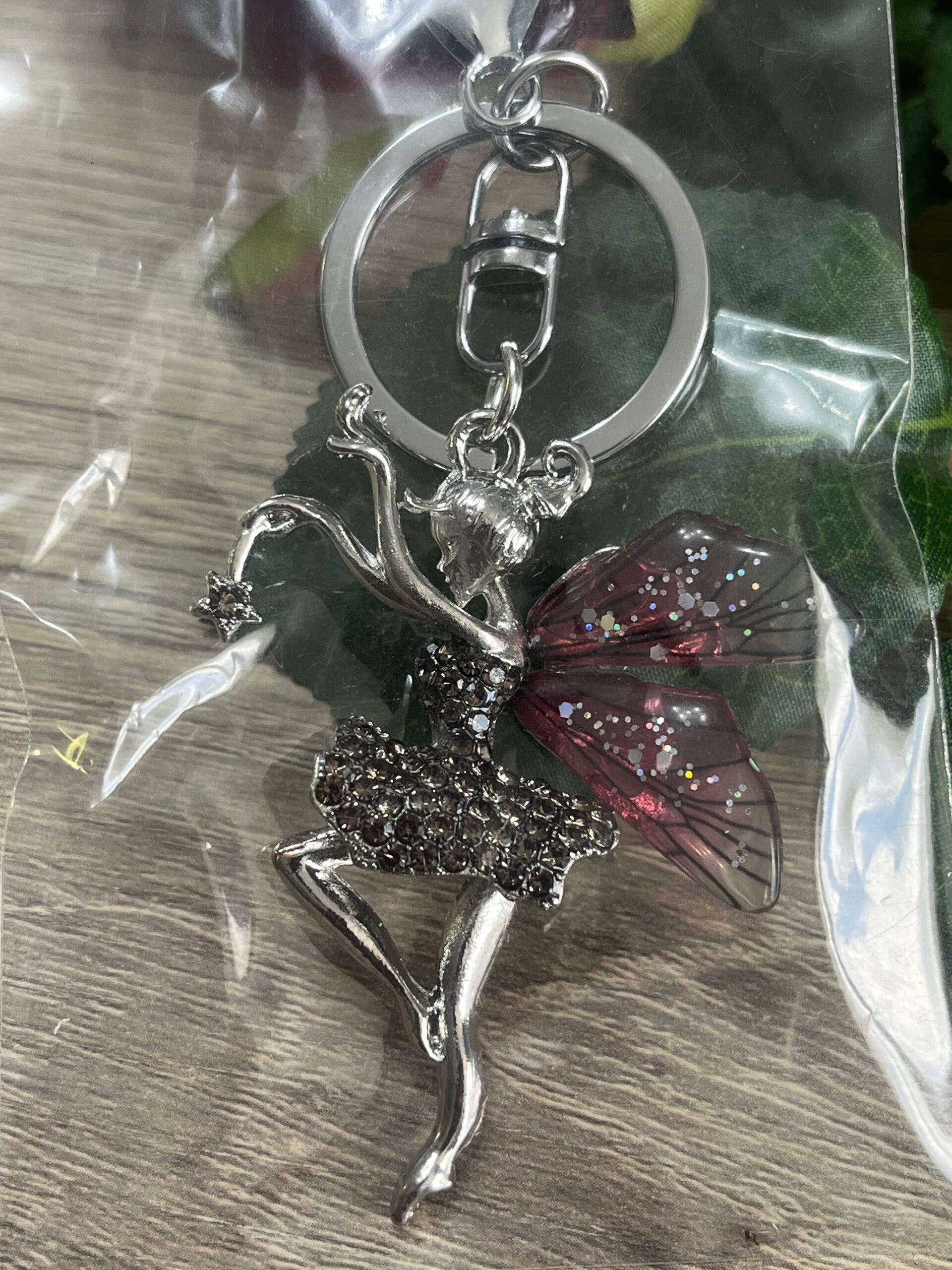 Porte-clés avec une jolie fée ornée de rose et argent.